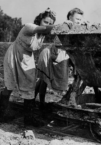 Gräben, Frauen und Männer schieben Loren voll Aushub zu den
